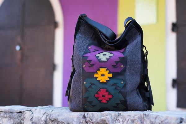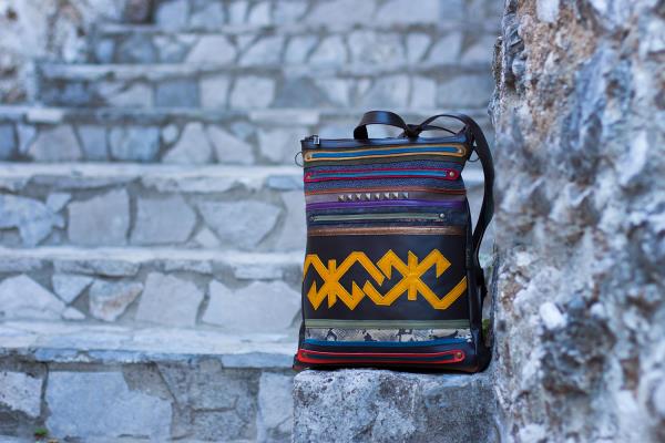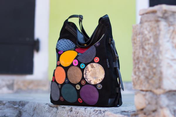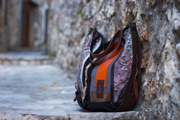 Samira was inspired by Picasso's portraits when she created this black leather bag. The colours range from brown, grey and blue to red and fluorescent orange. The shoulder straps have fixed length.
