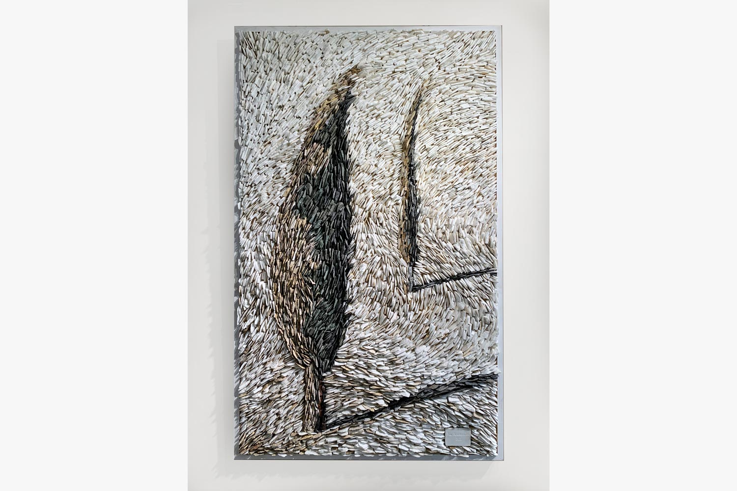 This mosaic features two cypresses in light motion. They are composed of green marble in the shaded part and yellow in the illuminated part. Their shadows are rendered with black Argos marble, and the wind-blown background with white Thassos marble. Eva Papadopoulou's technique is characterized by small fragments of marble that she applies onto a wooden board.
