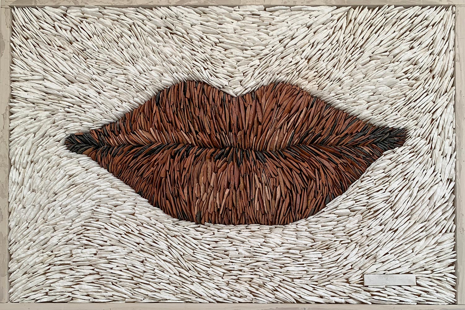 In this mosaic, the lips are portrayed with ceramic and red marble. Some light details are rendered with pink Ioannina marble; this subtle difference of shades gives some profundity to the representation. The background is composed of white marble fragments, in particular Thassos marble.
