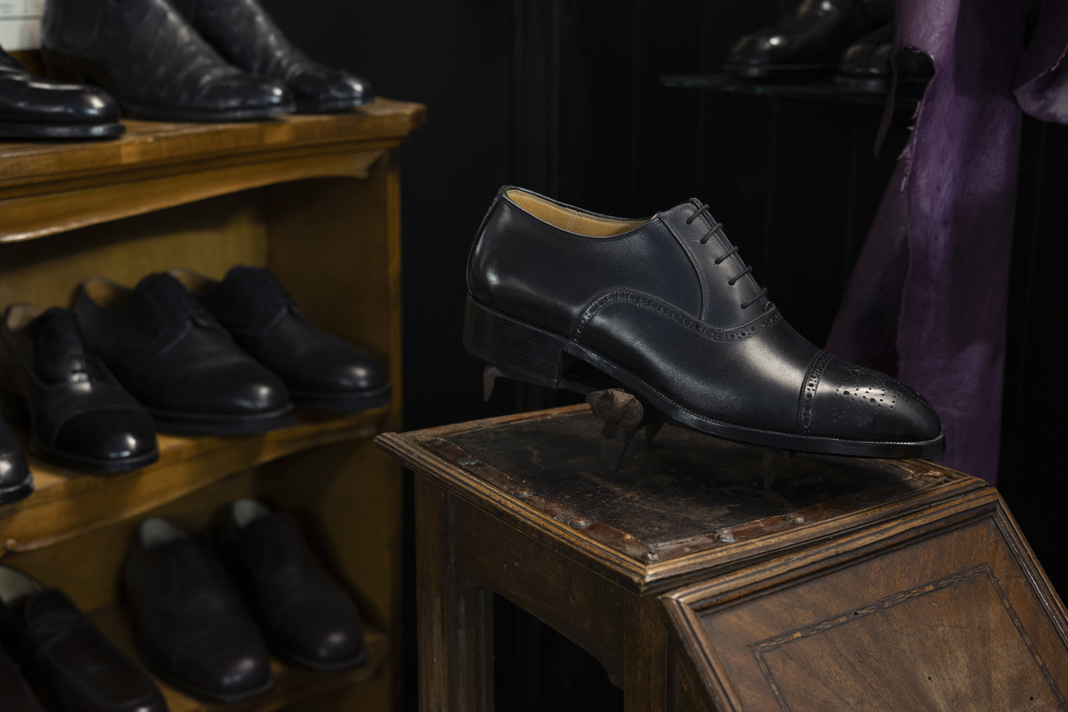 This custom-made pair of men's shoes are handcrafted from black calfskin using traditional techniques. This so-called “goodyear” (from the sewing machine) model is actually hand welted and sewn. The inner lining is made from natural kidskin, while the sole is made from leather. The shoes are finished with open lacing and five pairs of eyelets.