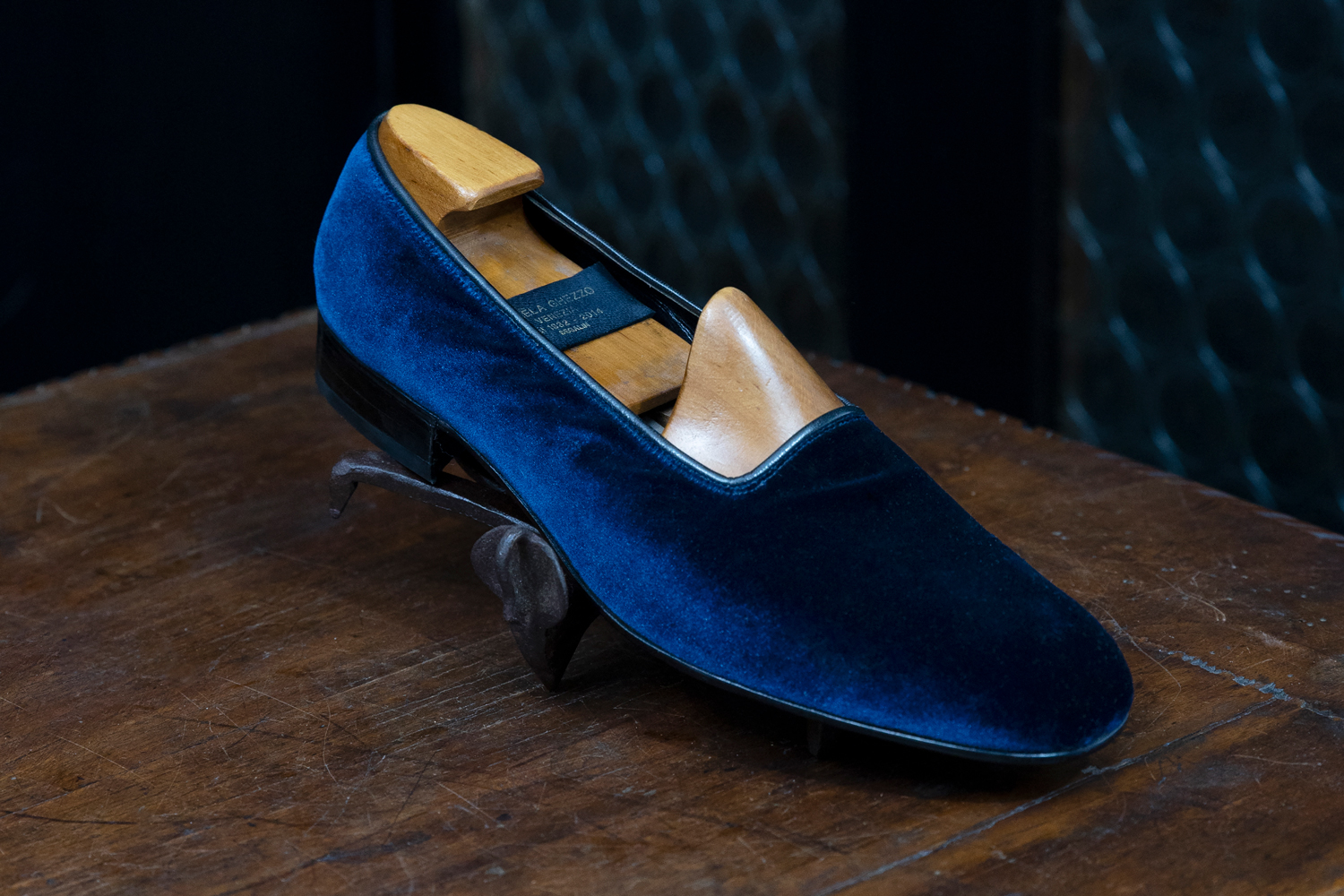 Conceived both for men and women, thanks to the simple elegance of their design, this pair of bright and shimmering blue loafers is handcrafted from shot silk velvet by Venetian master shoemaker Daniela Ghezzo and can be realised in various colours. The inner lining is made from natural kidskin and the sole from leather. The low heel is designed for the wellbeing of the back that needs the right support.