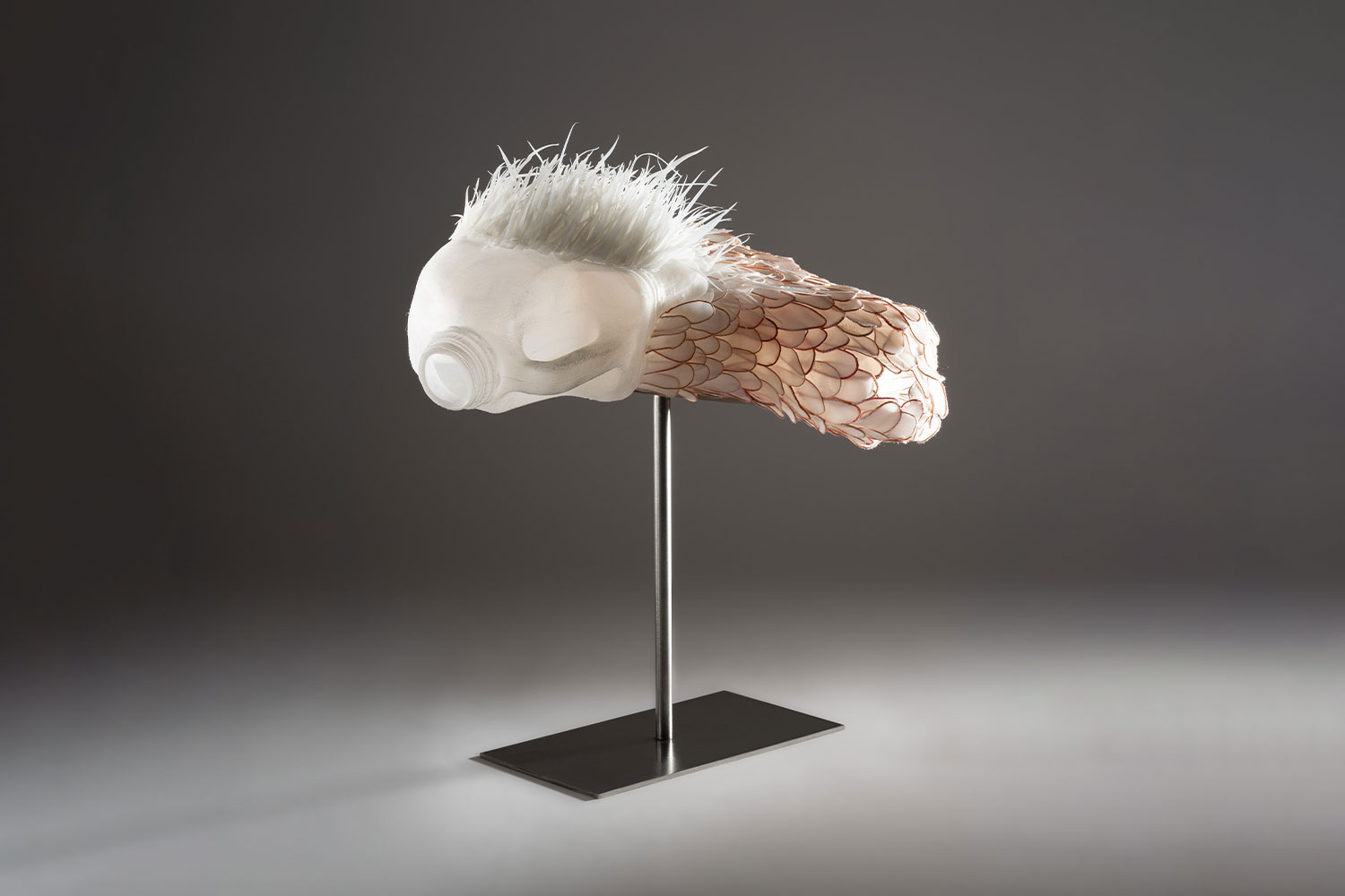 This organic looking sculpture sits on a metal plinth. It is half covered in scales and feather like wisps. The material used is HDPE from waste milk bottles. The scales are outlined with shades of hand dyed cotton threads in peach hues. These scales are pinned into place creating a robust structure belying its translucent delicacy.