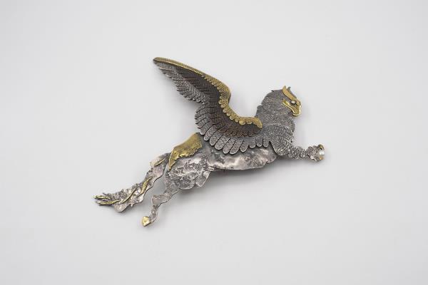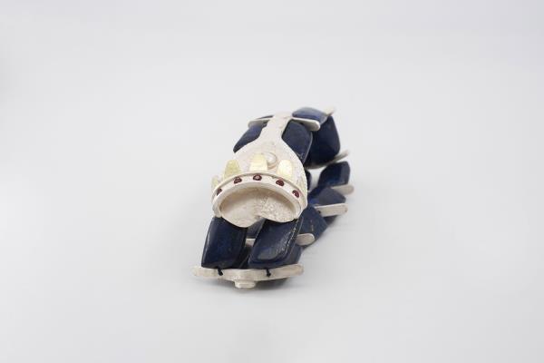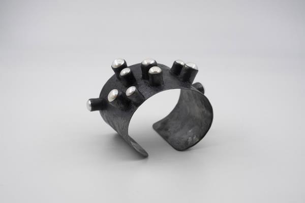 Made of burnished and polished silver, this bracelet consists of a clasp in the shape of a spider, whose body is divided from the head by a small spring. For making the head, Roberto used the net technique, while the body has incorporated raw handmade coral. The coral pearls are disposed on four silver threads. The material used for this bracelet is silver 925/000 and corallium rubrum mediterraneum.