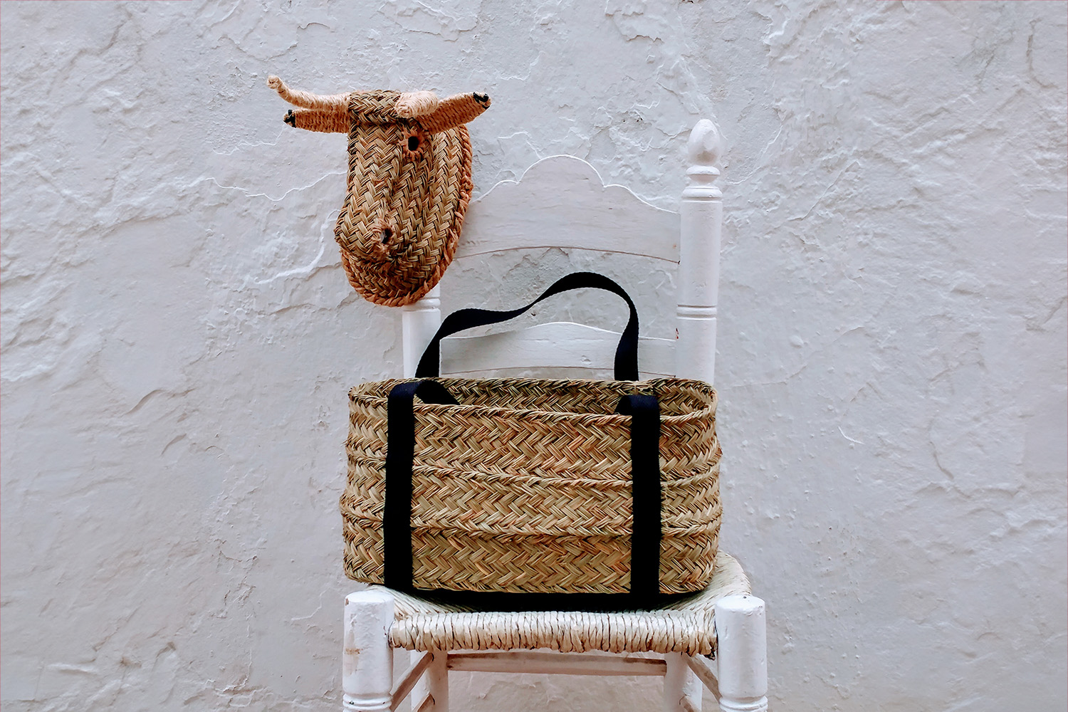 Here are a decorative bull head and basket with handles. They are both sewn with hemp thread that brings pleats together to form the final shape. The head is intended for wall hanging and features agave cord for the ears and horns.
