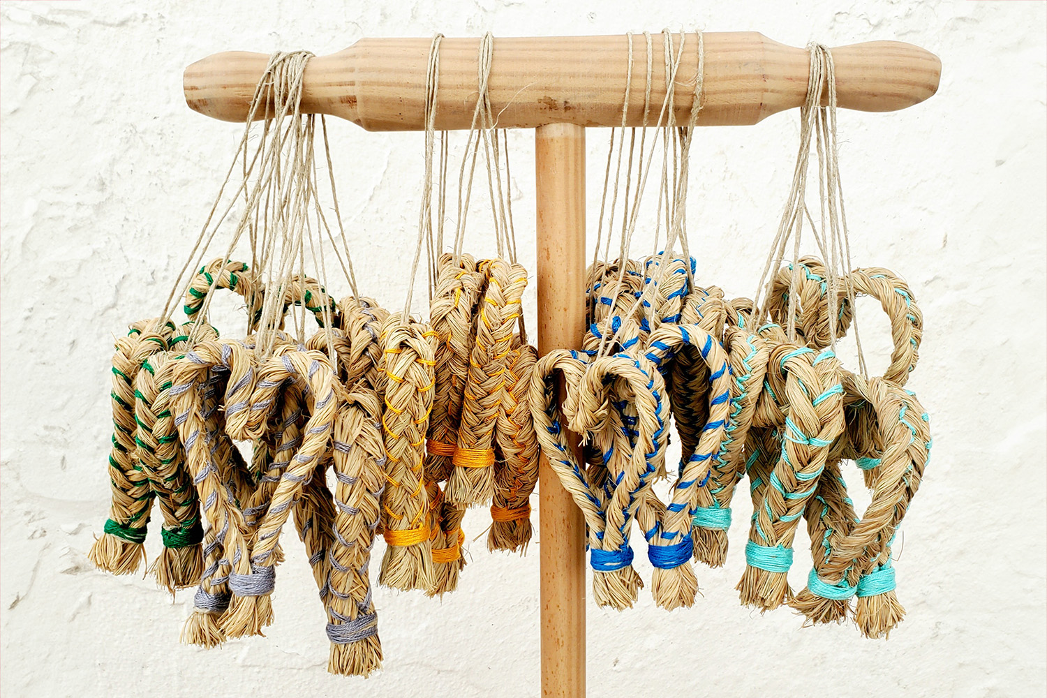 These objects are hearts of various sizes crafted with cooked mashed esparto gafera and adorned with threads of various coloured cotton. Gafera is a characteristic braiding technique in esparto work. The entire process was done by hand, from mashing to braiding.