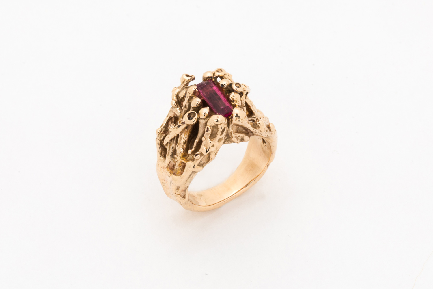 This ring is inspired by marine vegetation. It is made of red bronze and adorned with a pink tourmaline cut Baguette placed in the centre. The ring was made with the lost wax technique.