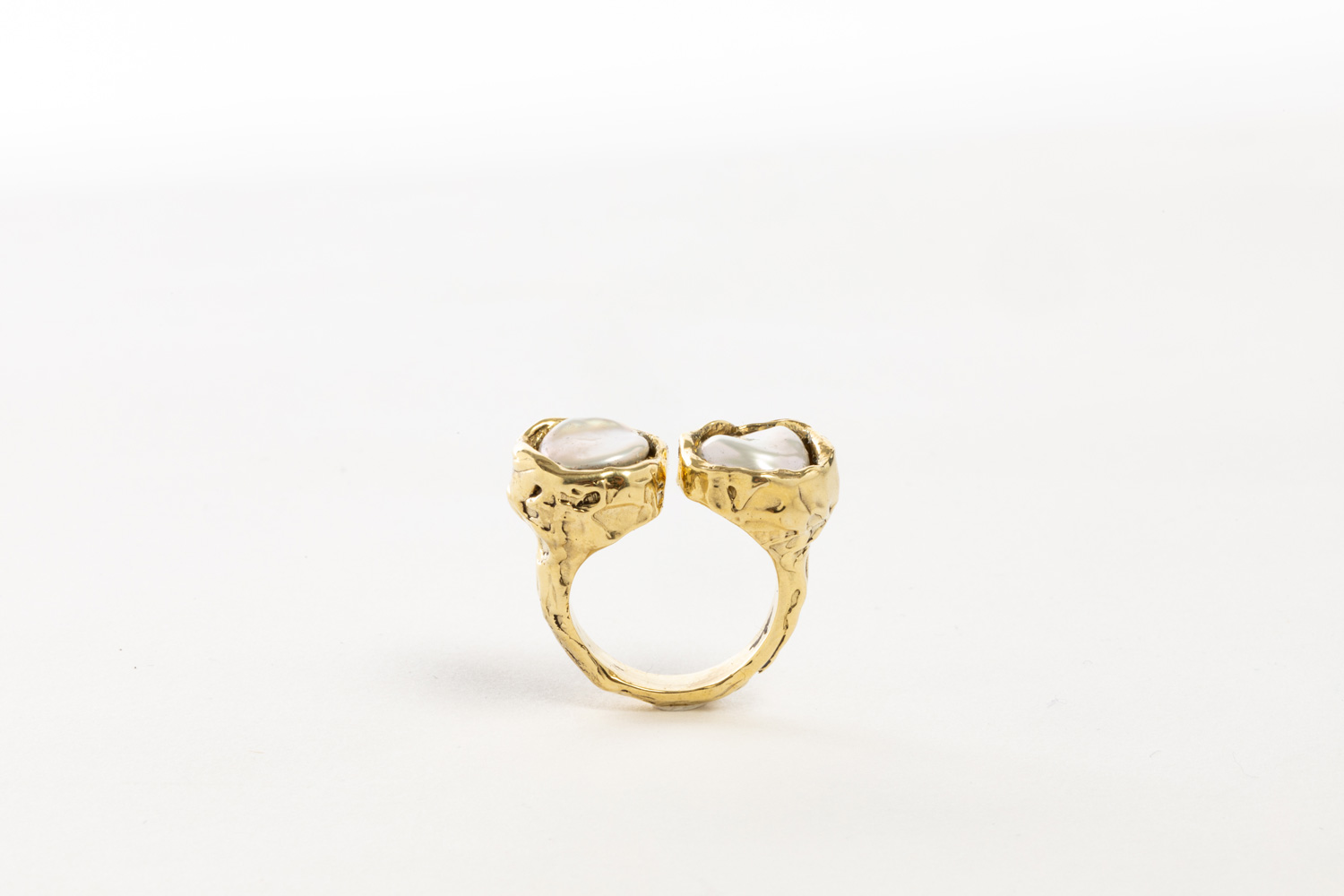 This yellow-bronze open ring has two natural keshi pearls on the upper ends. The yellow bronze surrounds the pearls and makes them stand out. The ring was made in 2021 with the lost wax technique.