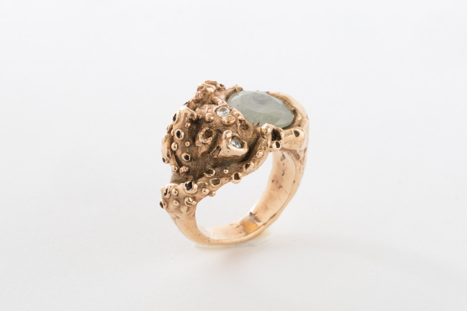 This red bronze ring is inspired by marine organic shapes. At the centre there is a green sapphire root, on the sides a special metal processing that incorporates two colourless zirconia.