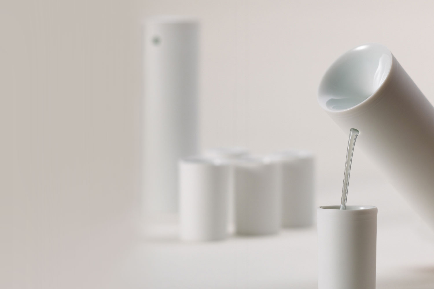 This porcelain liquor bottle set was made by attaching a conical-shaped upper part to a slim cylindrical body that can be held with one hand. If you put alcohol into the hole above, it comes out of the small hole on the side.