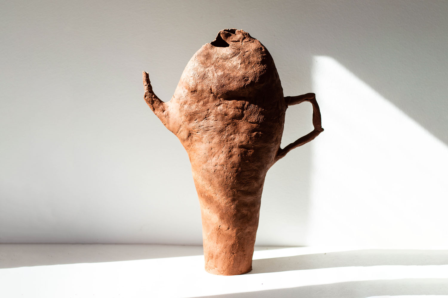 This teapot belongs to the Extraterrestrial series. A sculpture with no utilitarian value, it's made with dark red clay and coil construction. Decorated with different stone and wood texture imprints, the vase is fired at a high temperature of 1250 degrees.