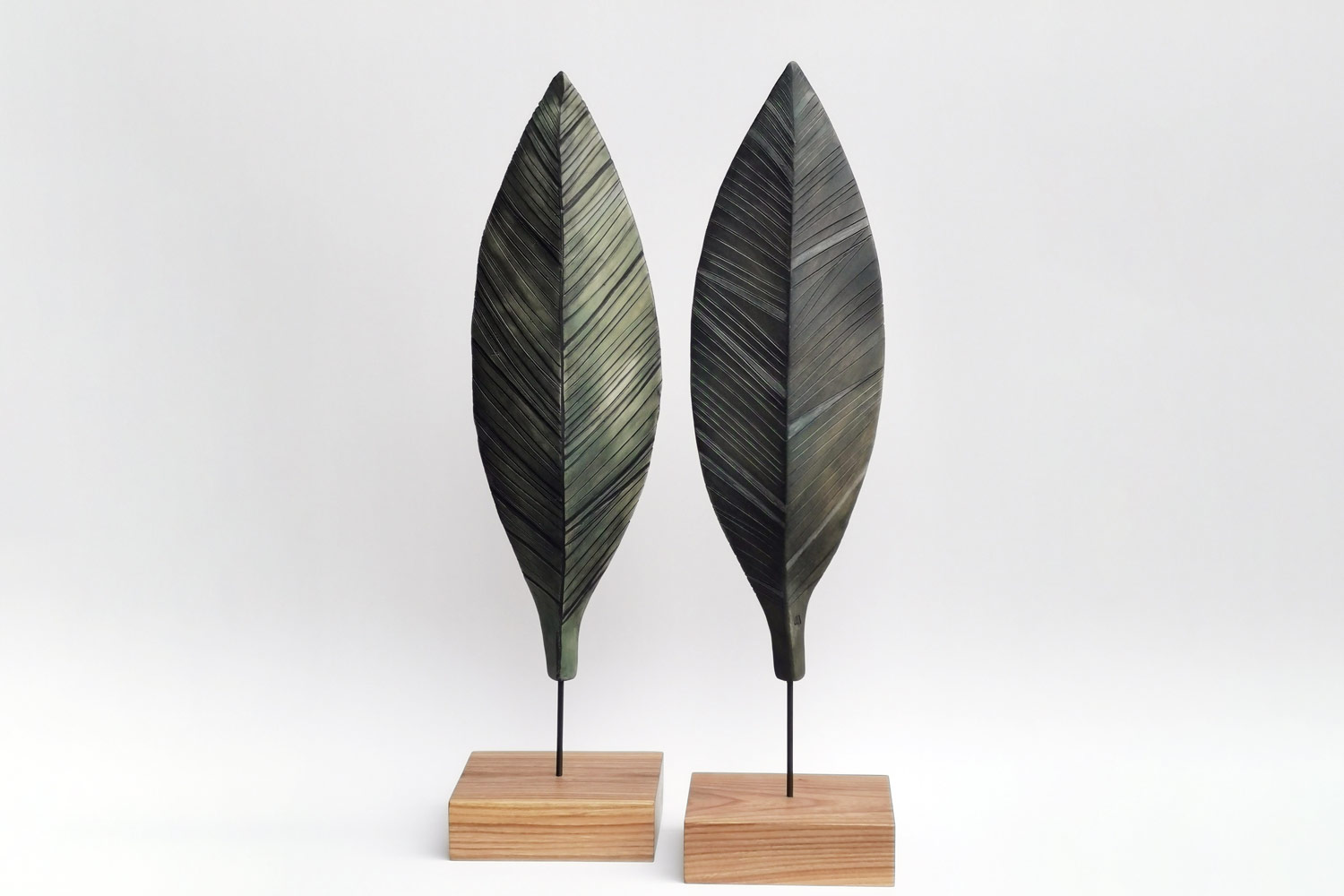 This two-piece stoneware sculpture pair is mounted on two wooden pedestals with two metal wire holders. Crafted in a traditional stoneware technique, it's finished with a matte glaze and hand-carved details to resemble motifs found in nature.