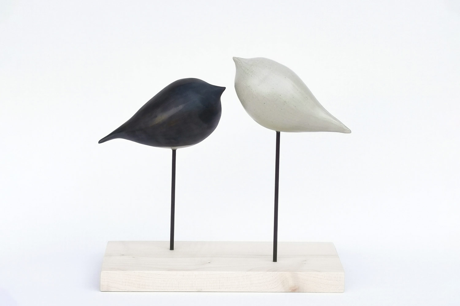 This two-part stoneware sculpture is mounted on a single wooden pedestal with two metal wire holders. Crafted in a traditional stoneware technique, it's finished with a semi-lustrous glaze shaped to resemble bird motifs found in nature.