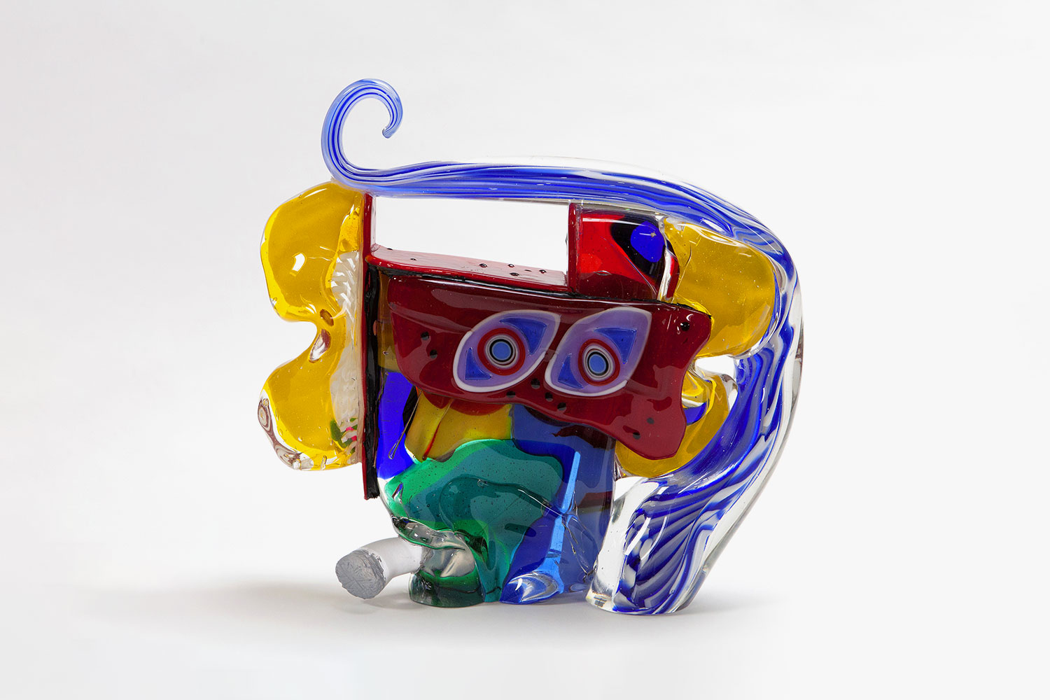 This is a glass statue of a head with a cigarette dangling in his mouth contemplating the emptiness of his existence, as symbolised by the empty space in the top left side of his brain. The statue is composed of fused layers of blue, yellow, green, and red glass and the cigarette has been added in transparent glass using moulding and sculpting techniques. A combination of fuse, blow and cold work has been applied.
