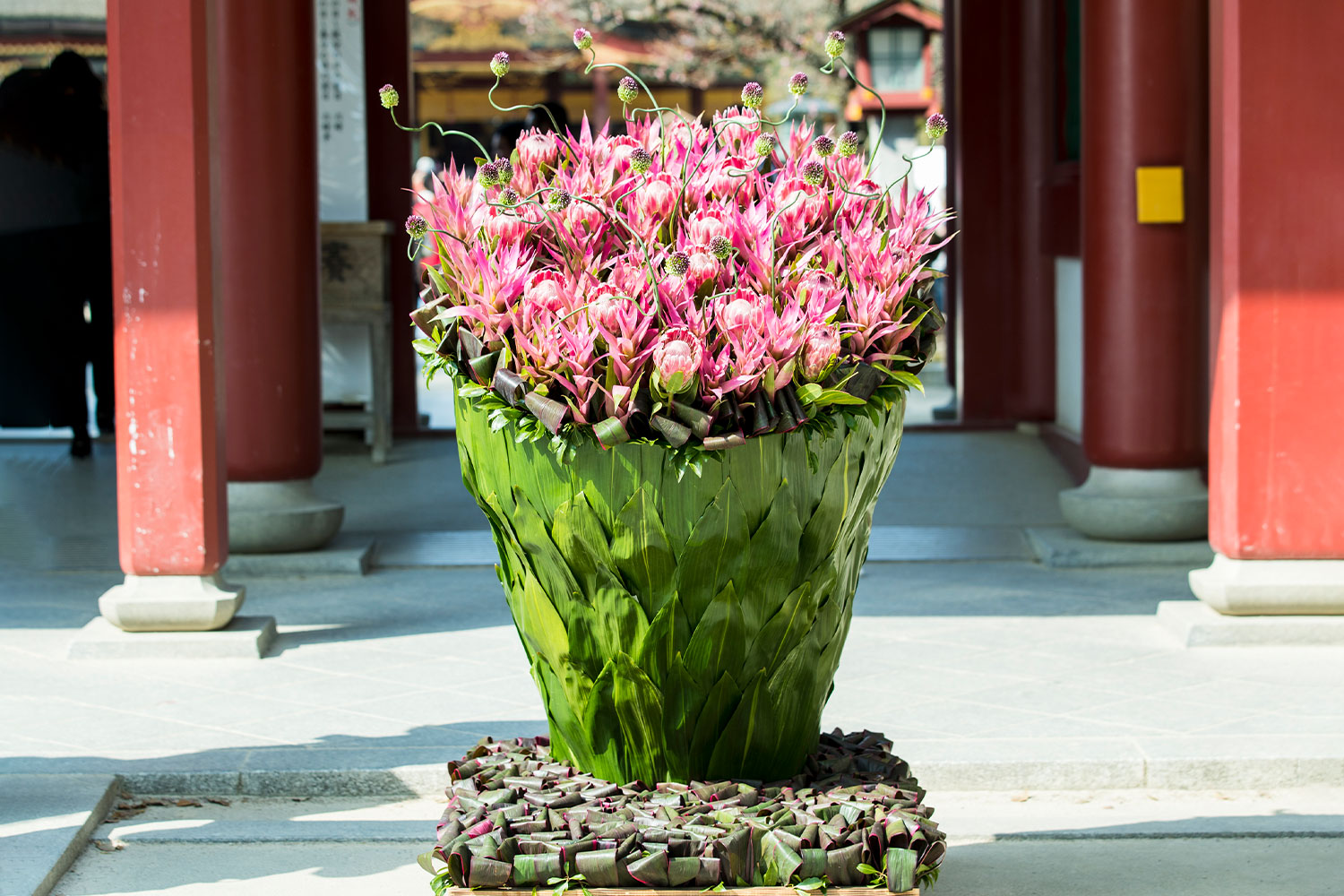 This powerful piece was created for the Sakura Gate of Dazaifu Tenmangu, a Shinto shrine in Fukuoka prefecture, with an abundance of native flowers: protea, guzmania, allium, cast-iron plant and dracaena. It's characterised by a very detailed leaf work: rolled leaves on the base and layered leaves containing the flowers.