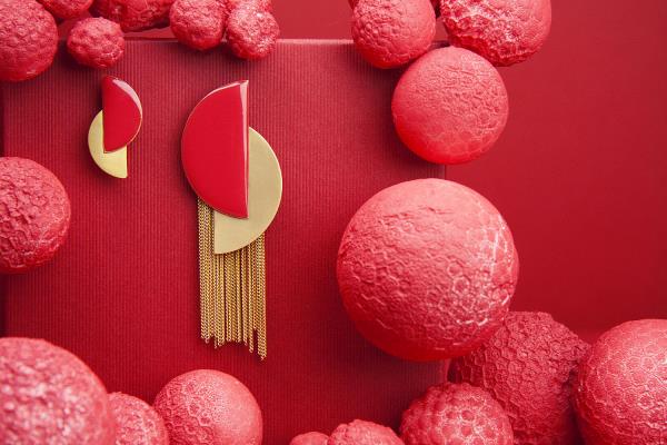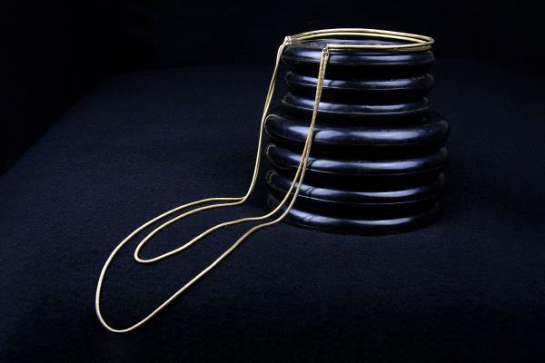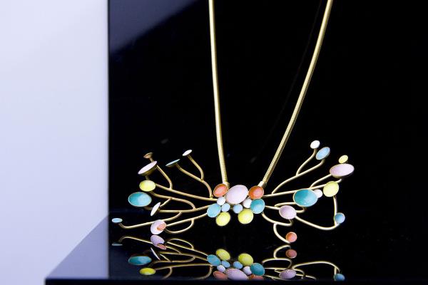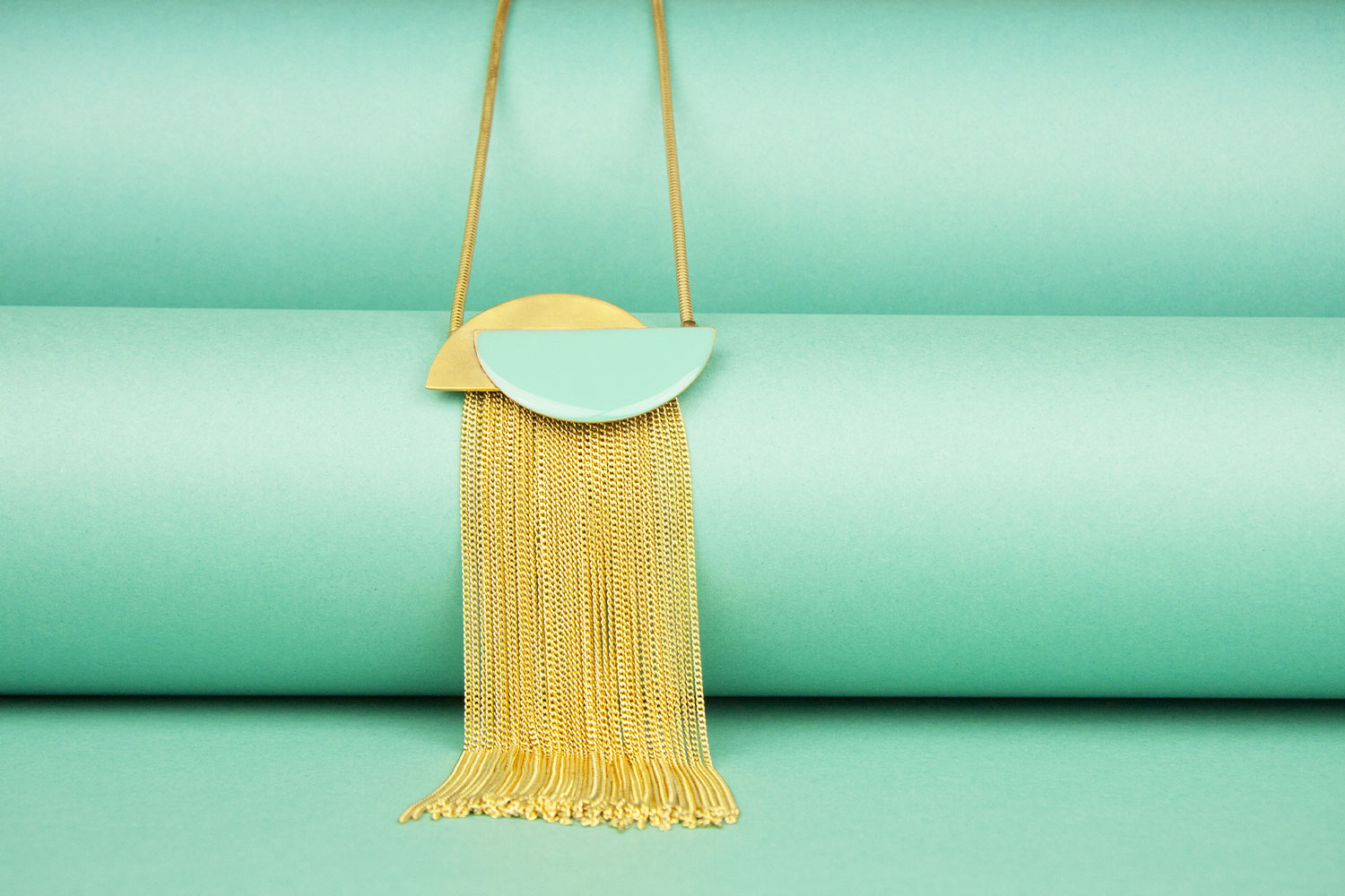 Long necklace with semicircles and cascade of chains of Deco inspiration. It is made with laser cut pieces, welding and chain braiding. The necklace is cold enameled with volume effect, 24k gold plated and lacquered.