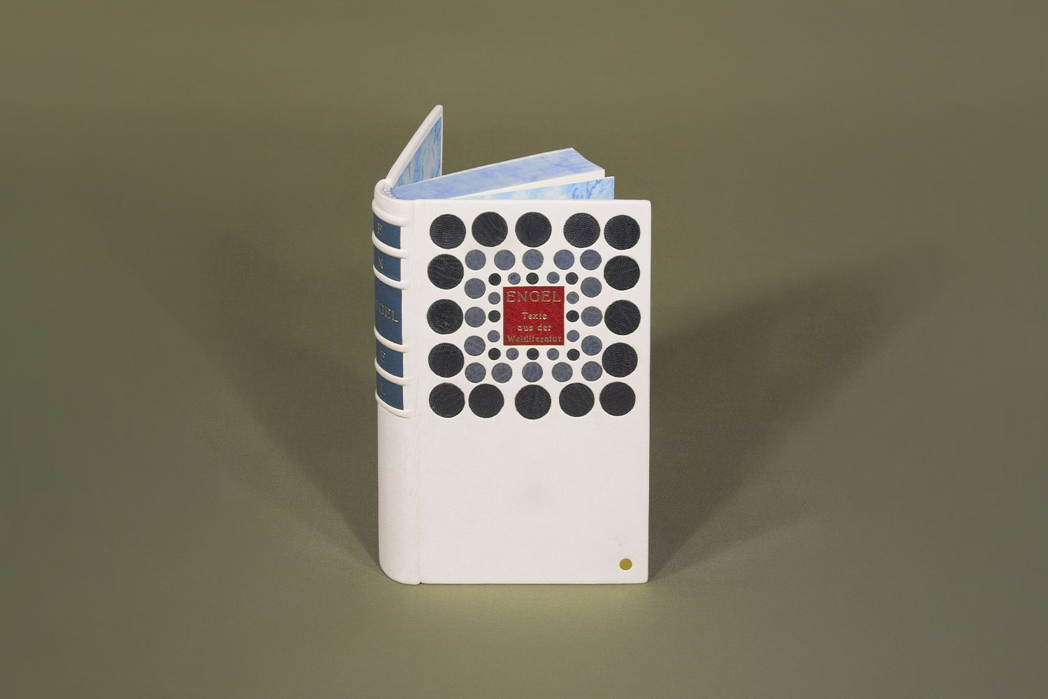 This book was made using full French binding in white goatskin with a leather mosaic. It features an embossed title, endpaper with watercoloured wings, hand painted book edges, hand embroidered capitals and thread stitching.