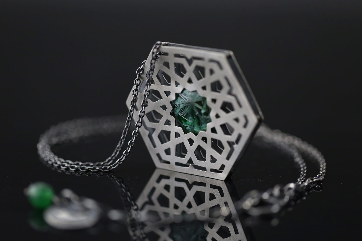 This geometric pendant, made of 925 silver, was cut in this openwork style to resemble Moroccan architecture. The hexagon-shaped pendant on a silver chain consists of two layers of silver. Between the openwork, a small cabochon was placed, made of green crystalline ceramics.