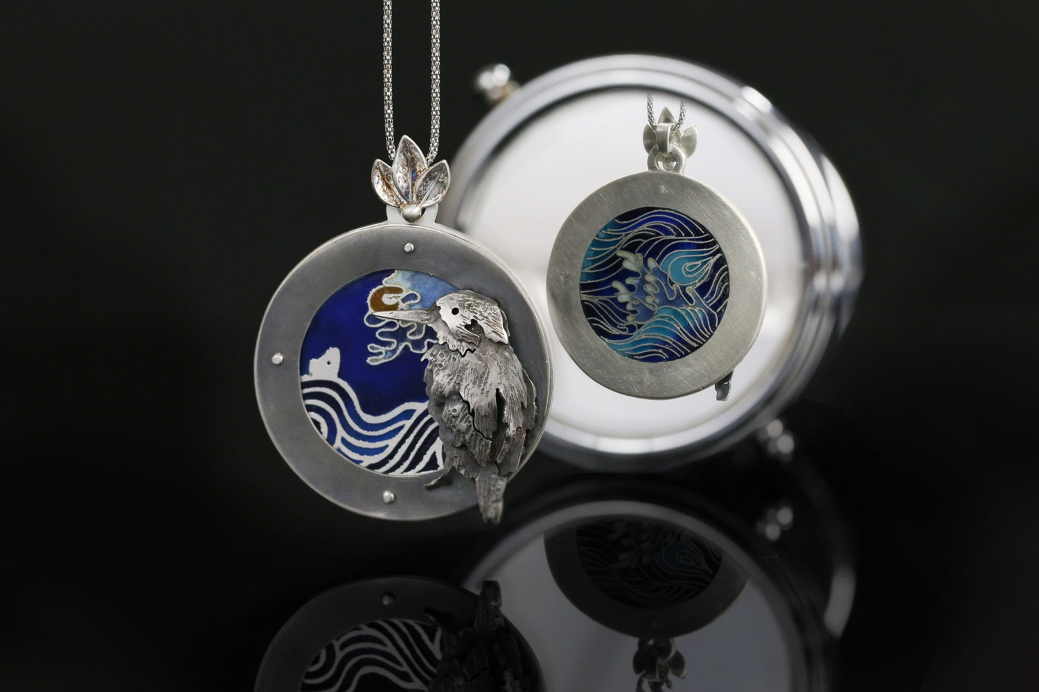 This double-sided kingfisher medallion is made from 925 silver. A high relief figure of the bird is placed on the front and covered with oxidated silver, which gives it a steel-grey shade. Right behind the bird there are hand-cut waves of water and blue sky. A similar colour, with a bit of turquoise, was placed on the reverse decorated with waves made of thin wires. The pendant layers are connected with rivets.
