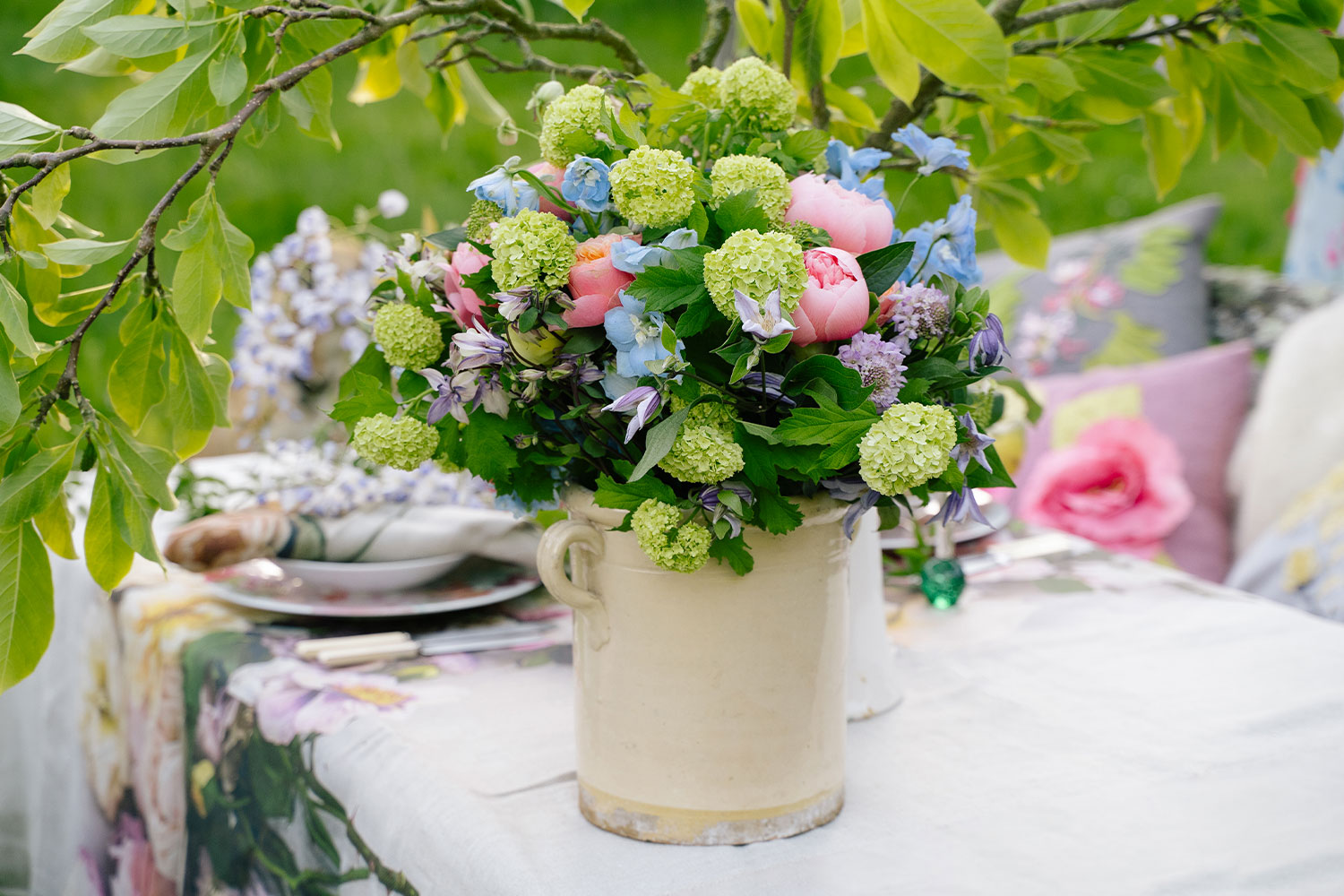 Touches of pink and light blue soften a green-colored bouquet arranged in a vintage-style vase. Flowers used are coral peonies, viburnum, scabiosa and clematis.