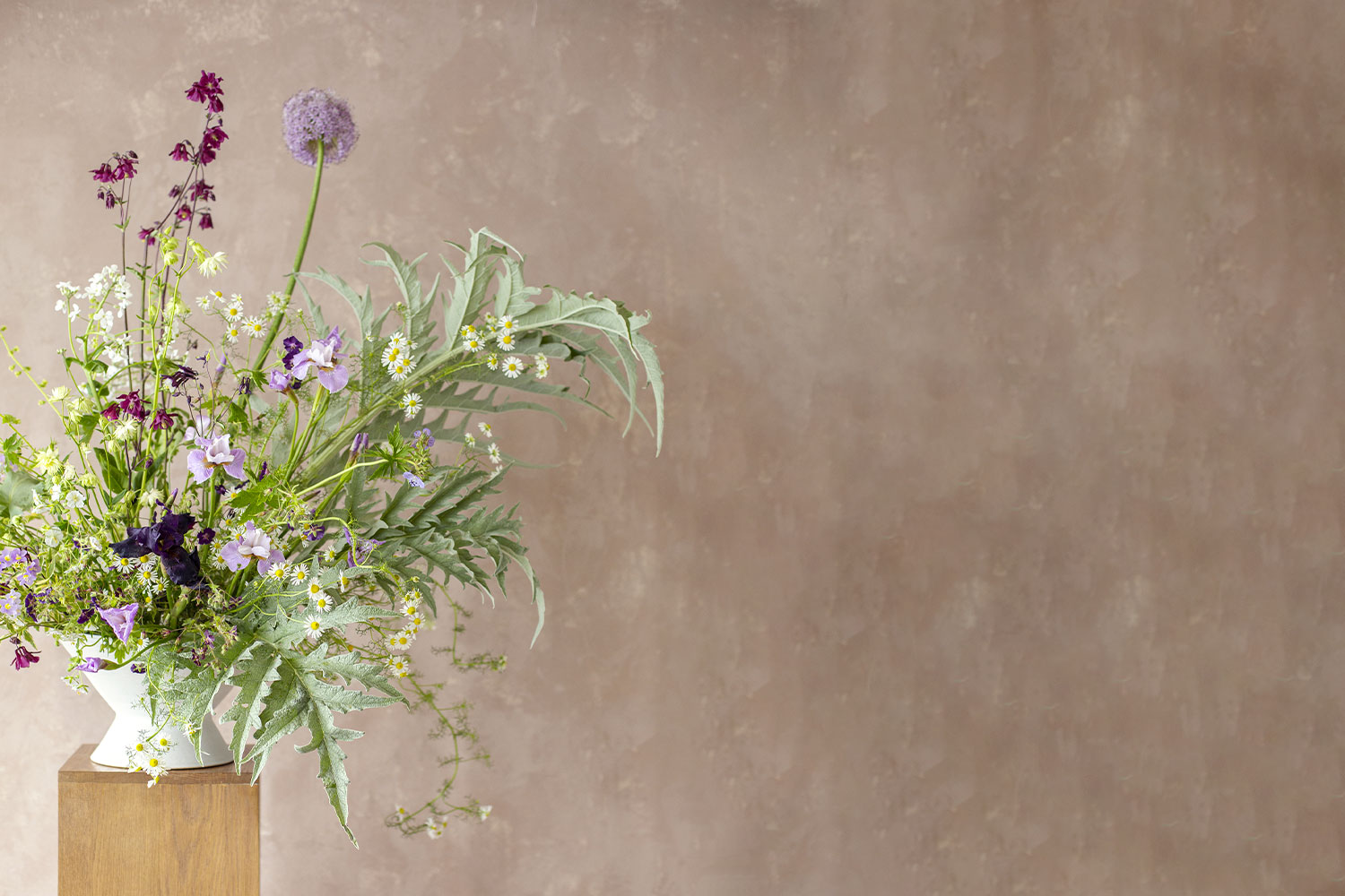 This dramatic, textural flower arrangement is presented in a contemporary ceramic bowl. The flowers used are cardoon, bearded iris, aquilegia, camomile and allium, in a cool colour palette of silvery greens, purple, cerise and lilac.