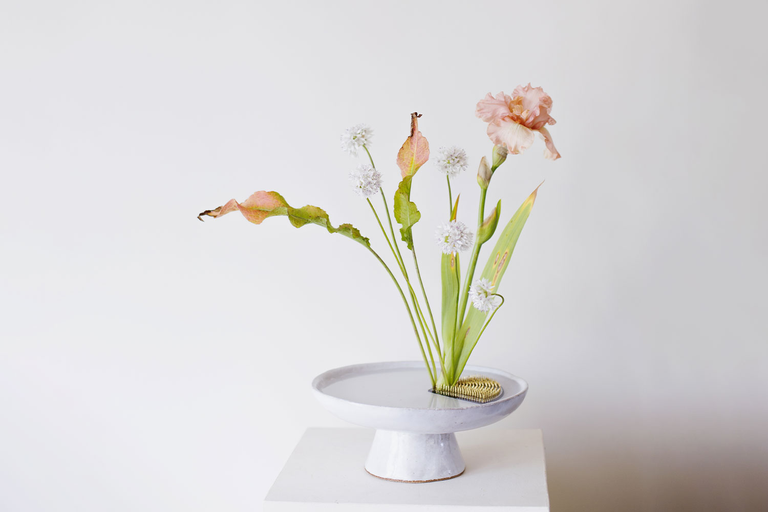 An Ikebana-inspired floral arrangement of sorrel, allium and bearded iris, placed in a shallow footed dish using a kenzan (“spiky frog”) for structure. The peach-toned iris is reflected in the tips of the dock leaves, while the allium provides form and textural interest.