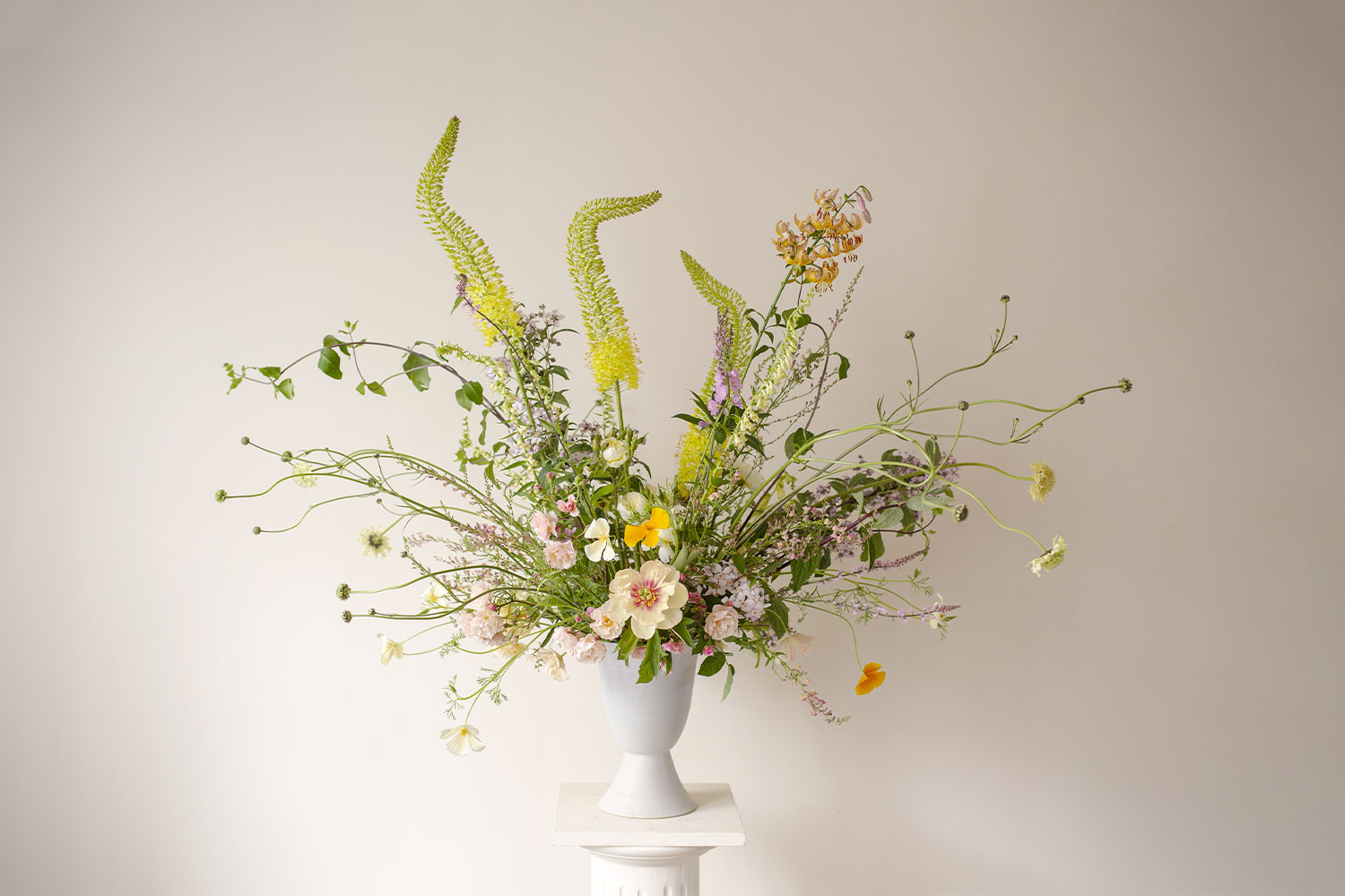 An exuberant urn arrangement with flowers from an early summer garden: foxtail lily, martagon lily, garden rose, giant scabious, peony, deutzia, toadflax, and California poppy. The colour palette combines soft blush pinks and peach, with accents of fiery orange and yellow for a 'glowing' effect.