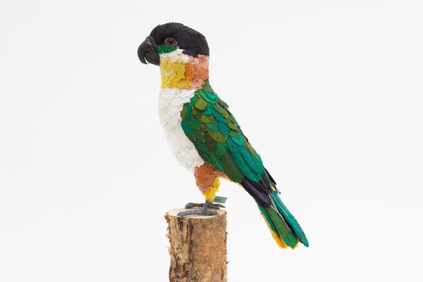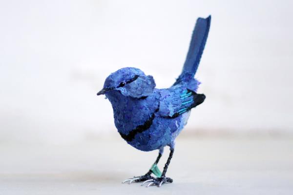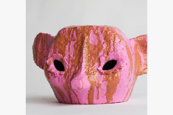 This sculpture of a fantastical Walrus, sculpted in cardboard, air-drying paper clay and pigment, with hand-carved wooden whiskers and tusks. The walrus is decorated with a camouflage pattern, created from paper clay pigmented with pinks, browns and oranges.