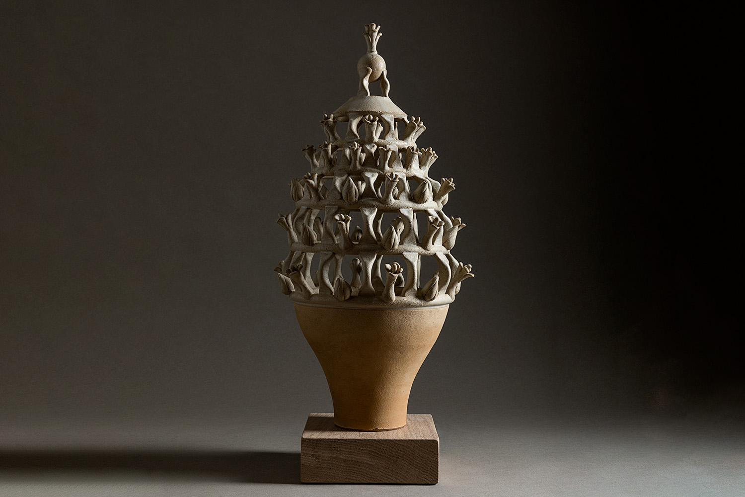 The lower part of the artwork evokes a cup on which a flowery cage rests. Ochre in colour, it is made of unglazed grès, using the coiling technique. The cage structure is made with five horizontal rings upheld by columns alternating with buds and flowers, culminating with a dome that supports a floral element. Glazes, created with a personal recipe, give a cream-coloured silky effect to the top part of the artwork.