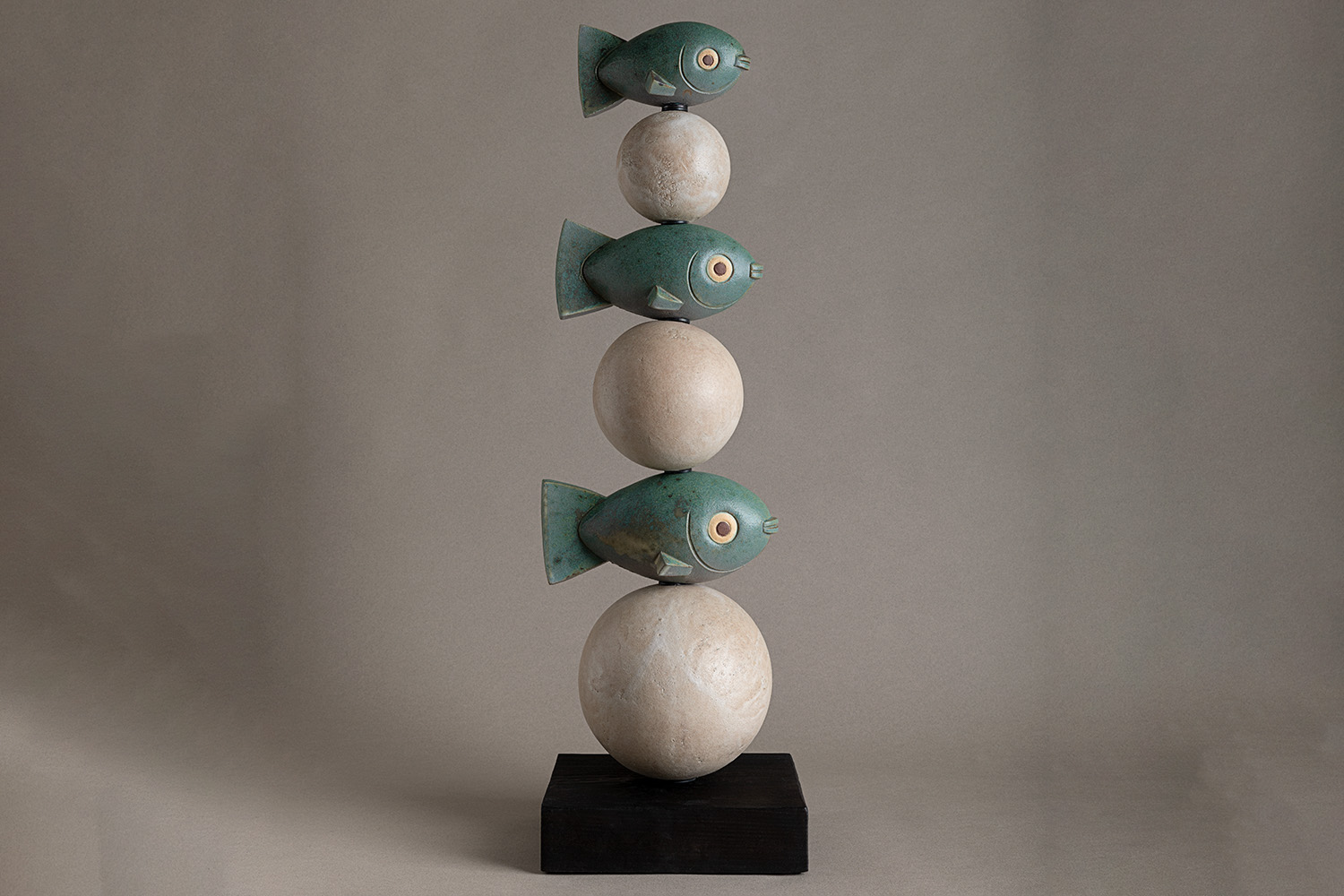 This artwork is made of six elements around a metal bar that is fixed on a square oak wood base, blackened by smoke. Three fish and three spheres alternate in decreasing size from the bottom to the top. All the elements are made of grès; glazes, created with personal recipe, confer special colours and silky effects.