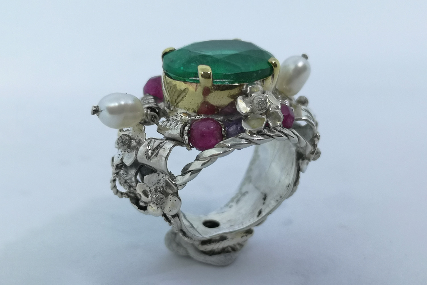 This ring is made of fire-worked sterling silver, with a setting for emerald, pendants pearls and ruby beads. It is a floral composition.