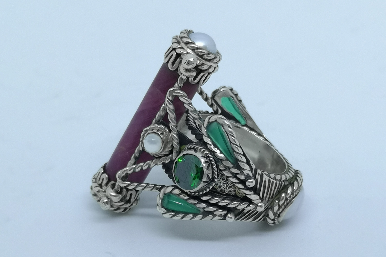 This ring is made of sterling silver. Each element is handcrafted and heat welded. Eleven griffes support a mobile purple tourmaline baguette.