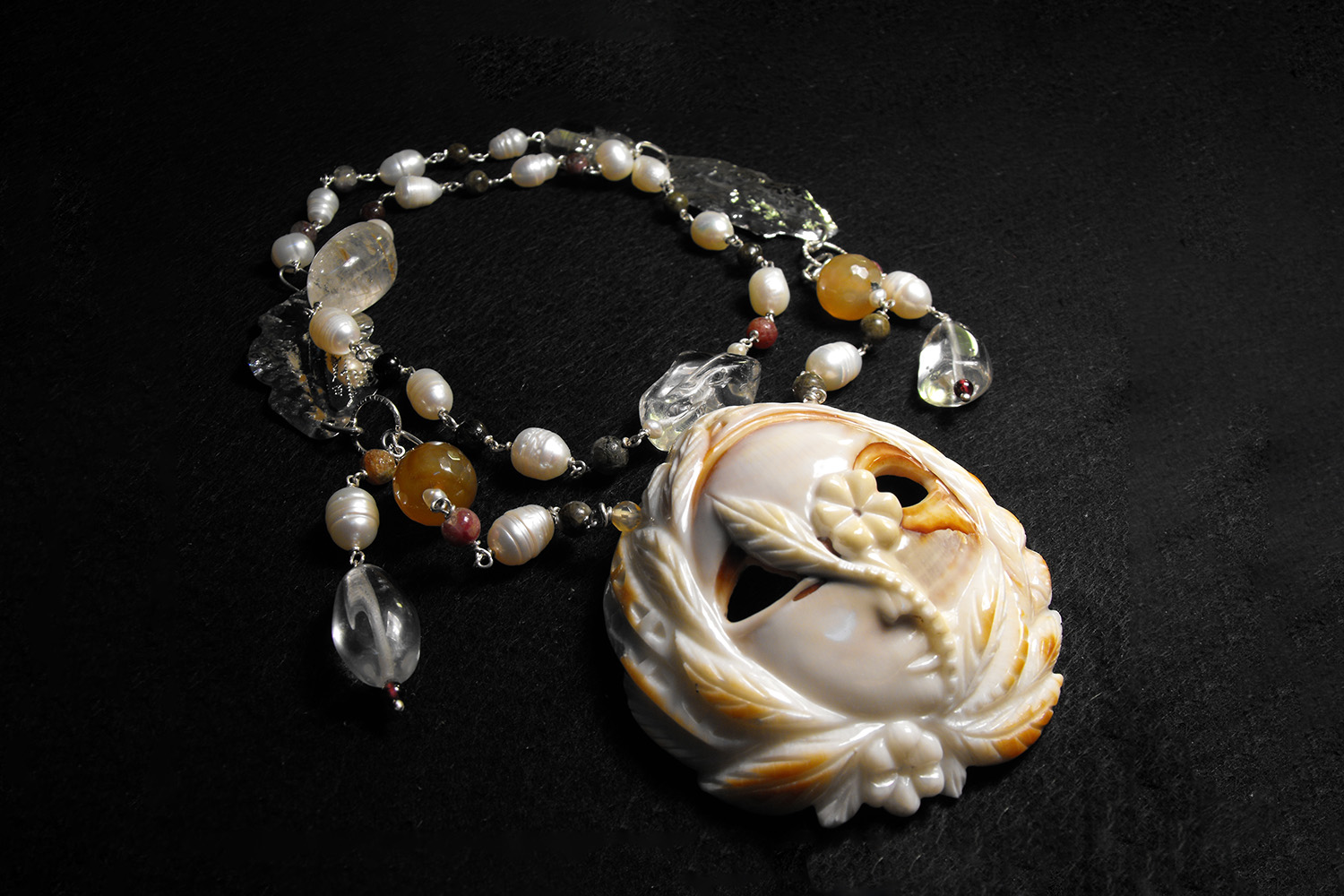 This is a long necklace of semi-precious stones in a range of earth tones, from pearls to carnelian and tourmalines. A hand carved shell centrepiece depicts one of the Janas, the fairies of the Sardinian woods.
