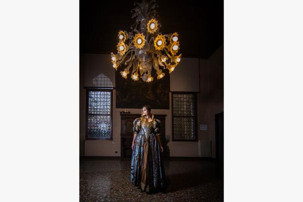 This dress is inspired by Tiepolo's painting “Neptune offers gifts to Venice”. It is made in viscose-damask with yellow and brick-red cotton woven using the matelassé technique. The crown is made out of trimmings, gold tinsel and glass.