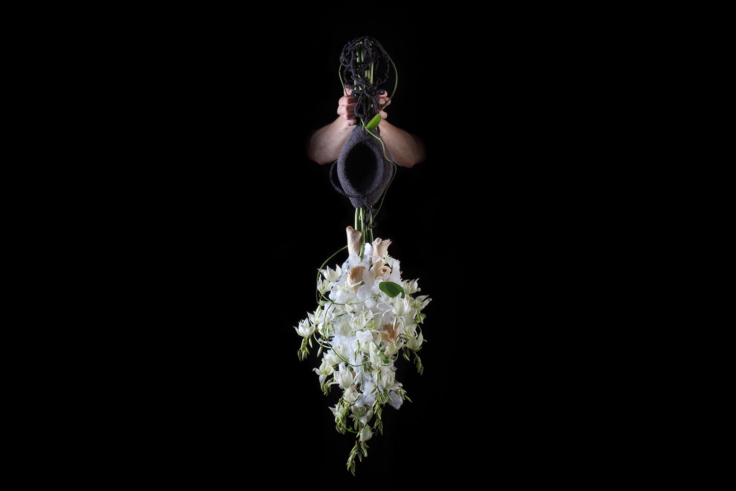 This design is the first piece of the artist's “Deconstructed reality” collection and evokes roots pulled out from the soil when they are still full of life. Nagy made a base from yucca stems, melted plastic into them and glued the flowers in an upright position, adding mushrooms and akebia tendrils. The upper part of the arrangement, where everything is hanging from, is made of carved dry floral foam and decorated with poppy seeds.