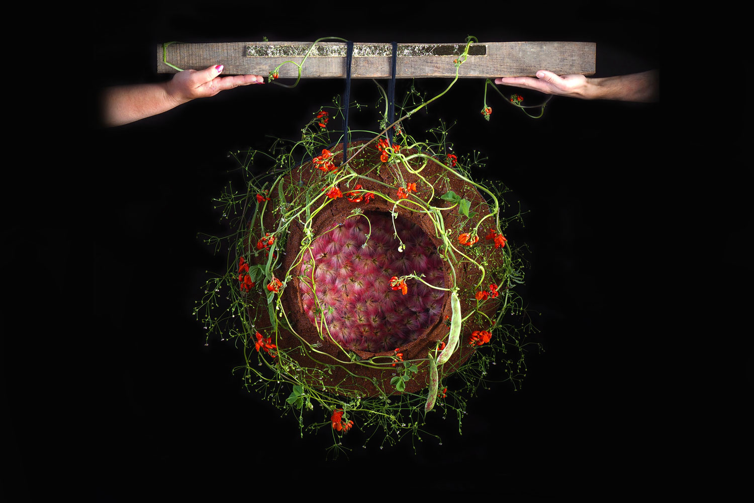 Part of the “Deconstructed reality” collection, this design represents Nagy's idea of balance. Its main core is a wreath of bean flowers and tendrils with albizia flowers at its centre, arranged on a base of black paper decorated with seeds. The wreath is hanging from a piece of wood embellished with golden details, held just by two subtle woollen threads.