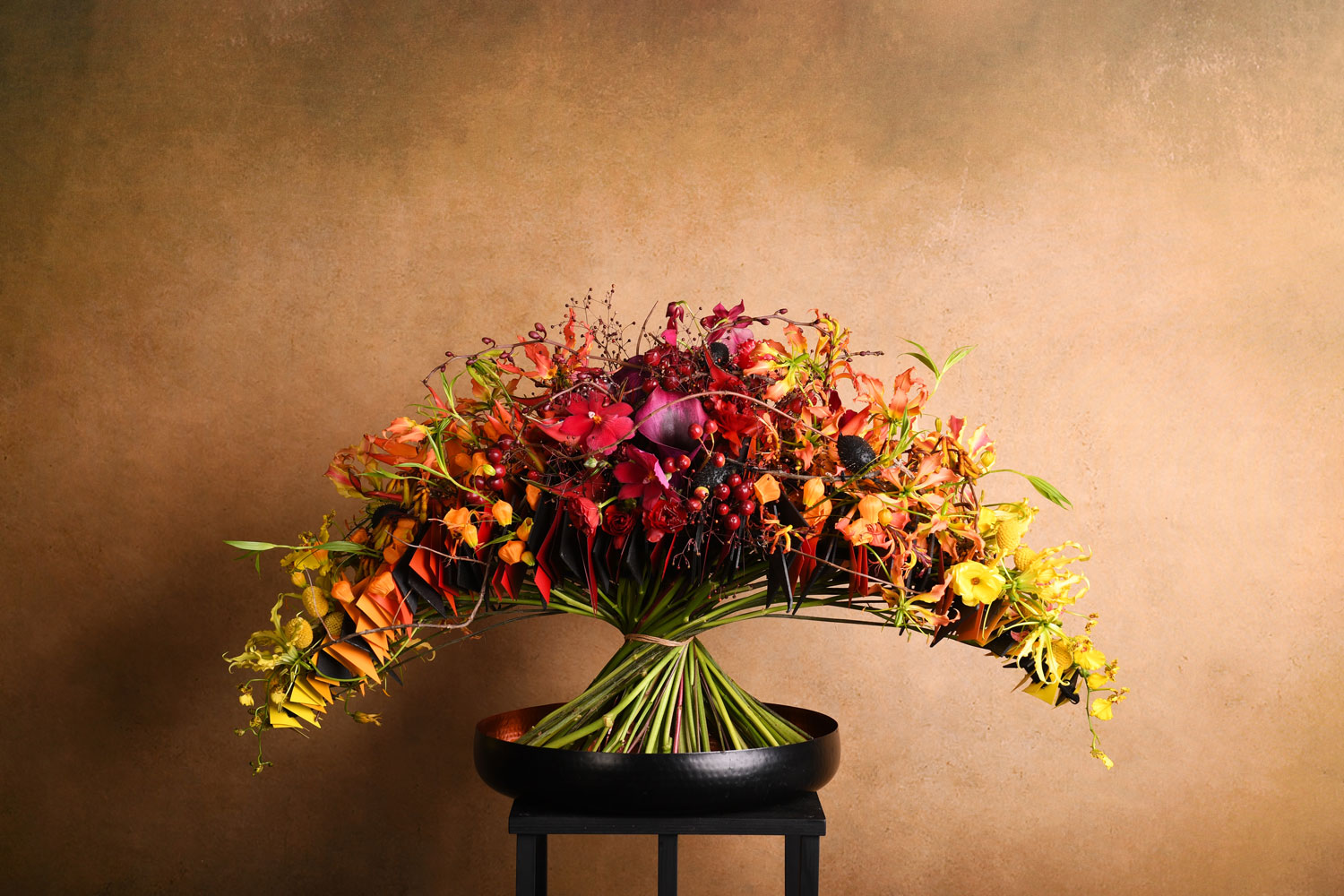 Many different flowers from calla lilies to ranunculus, hypericum and others, all chosen for their warm colors, compose this autumn-inspired design along with wires and pieces of plastic of the same hues, that form the base of the bouquet. Arranged with the spiraling method, which consists of criss-crossing the stems in the vase, the bouquet follows a color scheme that goes from lightest on the sides to darkest in the middle.