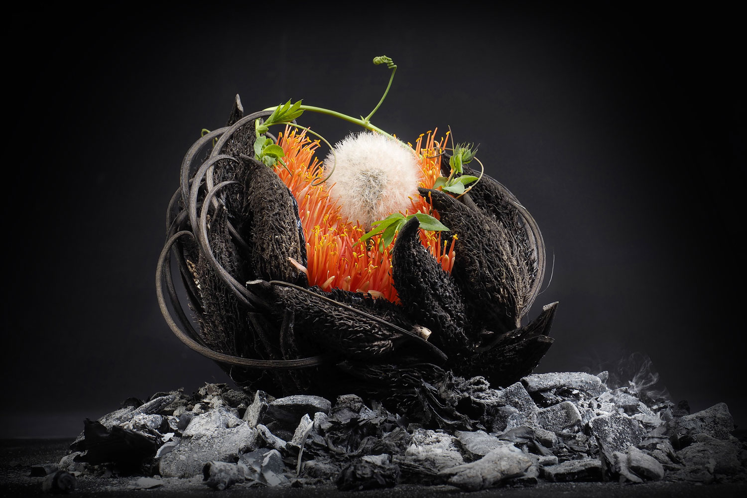 Part of the “Phoenix” collection inspired by the mythological bird who rises from its ashes, this work evokes the birth of something new after a personal, intimate transformation. The base is made from dried materials shaped to form an open eggshell, with scadoxus petals and passiflora tendrils inside. At the very centre, the artist's favourite flower: a single dandelion.