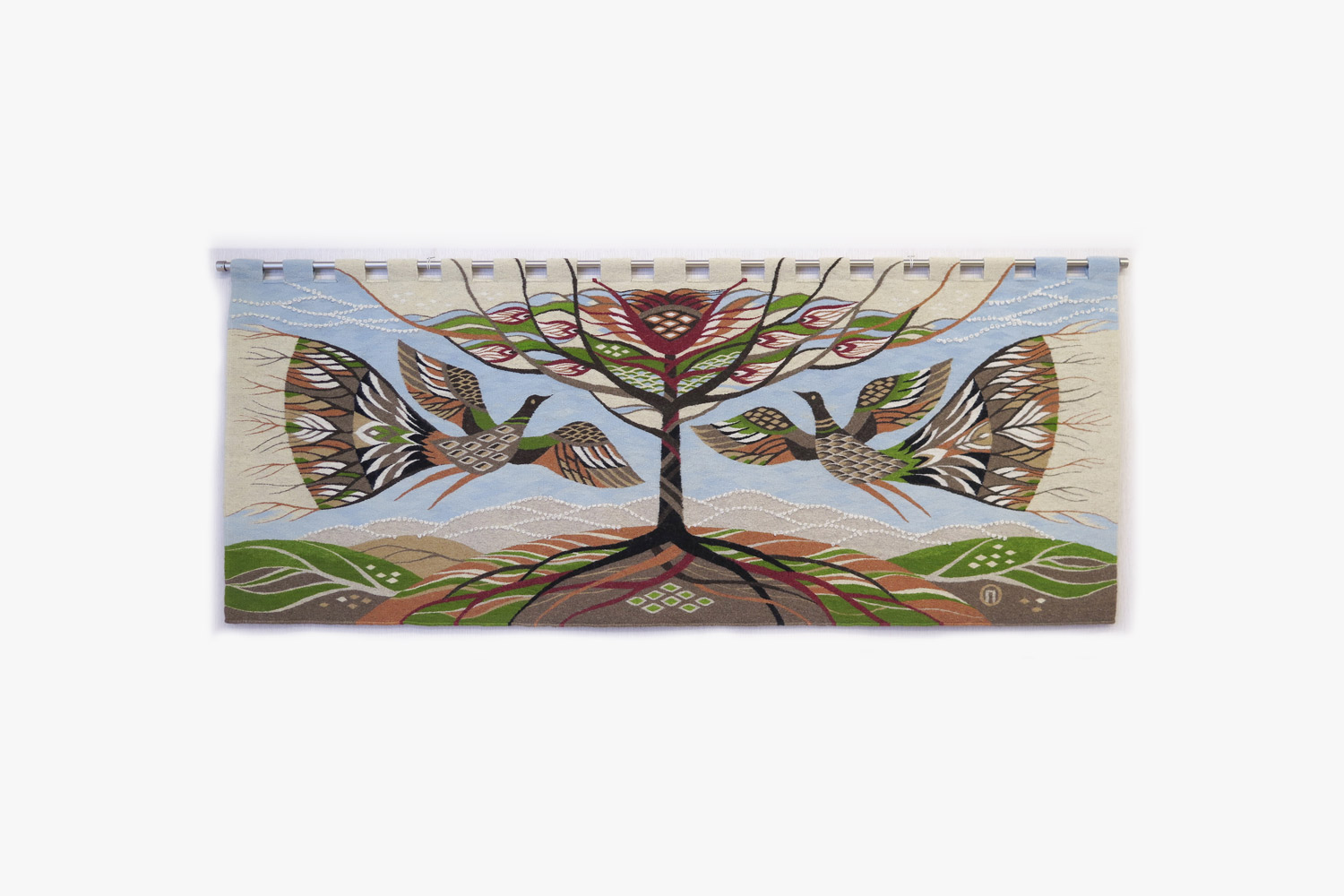 This handmade tapestry, created in the technique of double-sided smooth hand weaving. Woven from natural wool yarn on a cotton base. In the centre of the composition is a decorative symbolic tree. On either side of it are two large birds flying towards it. The main colours – close to natural shades – are blue, green, brown, burgundy and terracotta.