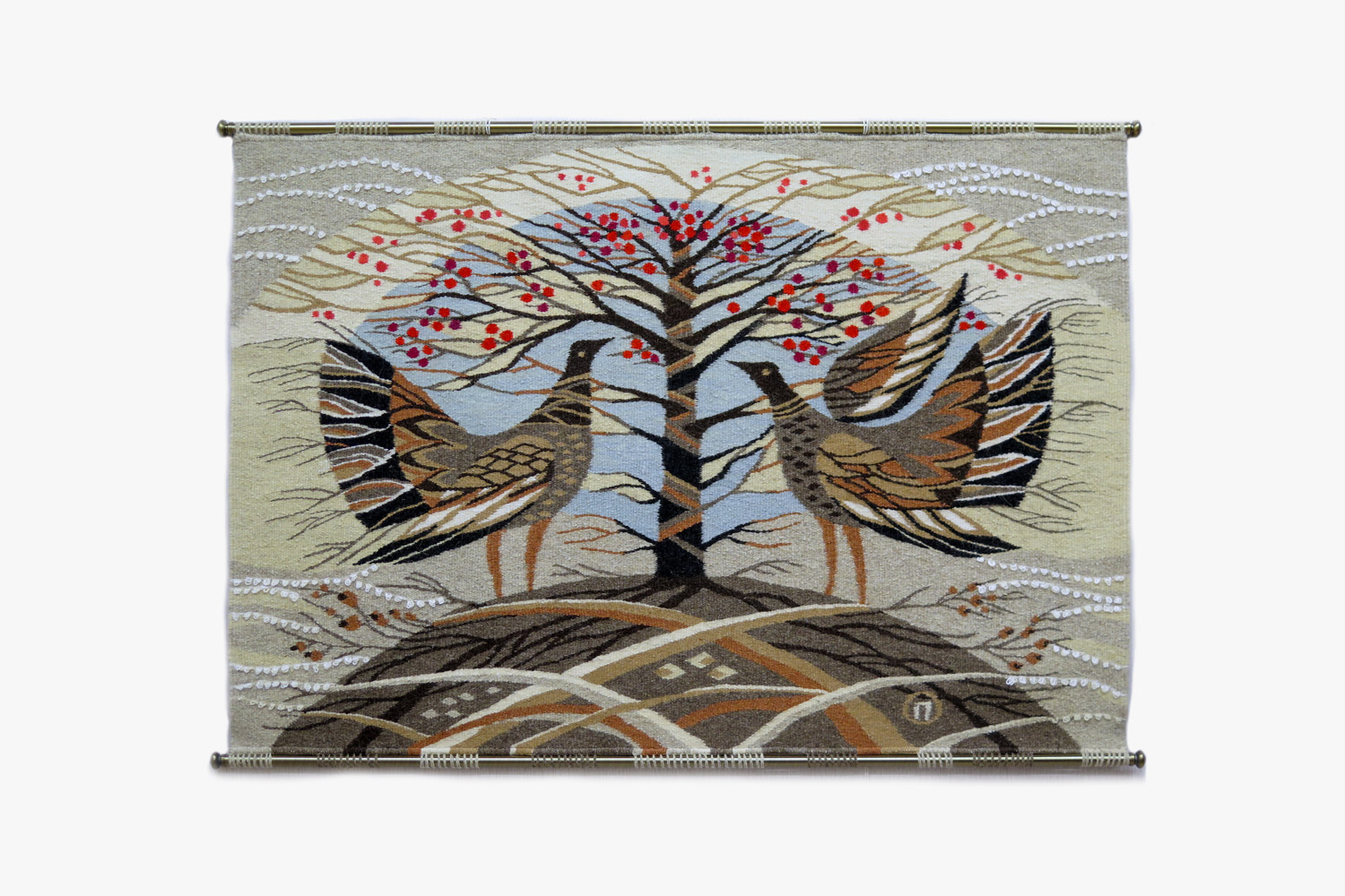 This tapestry has a rectangular shape and is made from natural woollen yarn. It depicts a decorative symbolic tree with red fruits. There are two large birds standing, staring at each other, leaning towards the tree. The main colours are close to natural shades, blue, grey, brown, terracotta and ochre. The object uses the Ukrainian traditional motives of the “Tree of Life”.