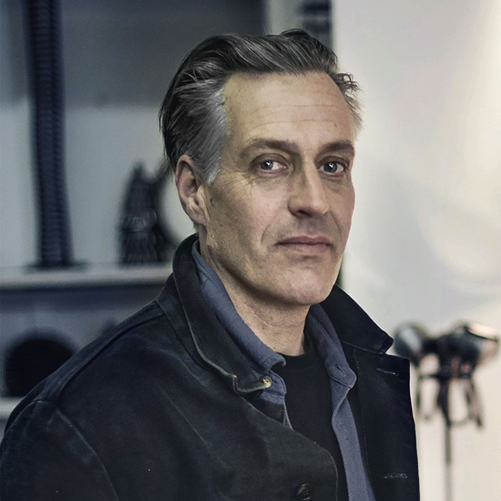 This ceiling light is made out of two conical glass lenses, connected with a formed band made out of steel. The moveable object hangs between two joints, connected to each other through a bent steel pipe. Therefore, the egg-shaped corpus is moveable in all directions. The LED stripe and two sheets of a special light-reactive foil are located in the hidden space between the two glass lenses, which are responsible for the changing colour reflections inside the glasses.