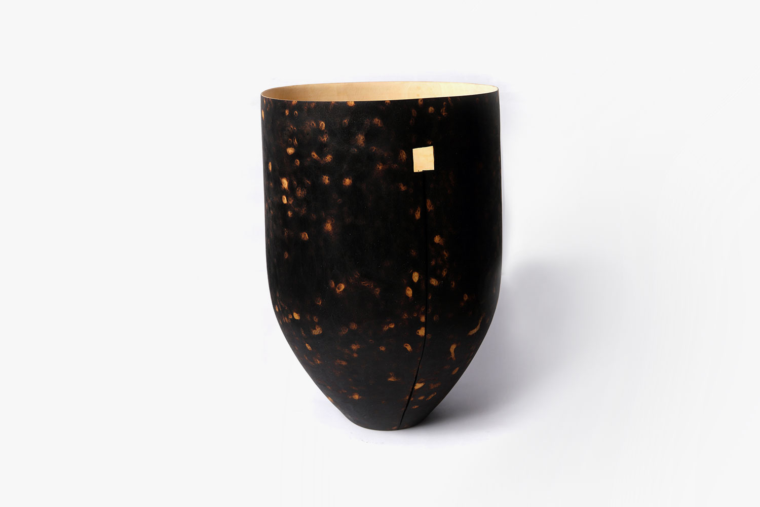 This jar features a pattern that resembles the Milky Way. It is made from birch trees grown in the barren alpine regions of Korea. The artist's signature style, "Abstract Tanhwa," involves burning the wood's surface to create a unique texture and colour. The work's square hole shows the natural beauty of the wood and functions to prevent further cracks.