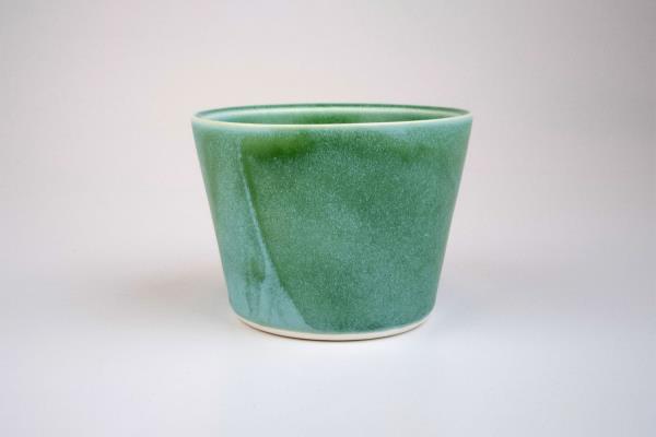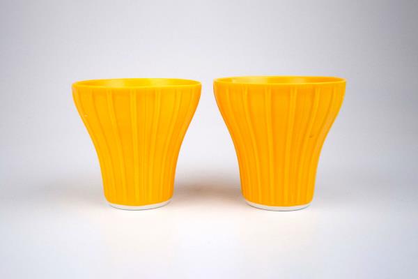 This jar with a lid by Chris Donnelly is made from white stoneware and finished with a matte orange glaze. It is made on a jigger jolly machine from plaster models. The models were turned on a lathe and moulds taken from them. There is a radial texture coming from the centre of the lid, and on the underside.