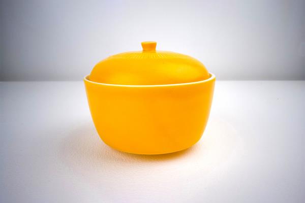 These Chris Donnelly cups are made on a jigger jolly machine out of white stoneware and finished with a matte orange glaze. The model for the cup is 3D printed. Working moulds made of plaster are taken from the model. The fluting on the sides of the cup have been inspired by antique dessert glassware.