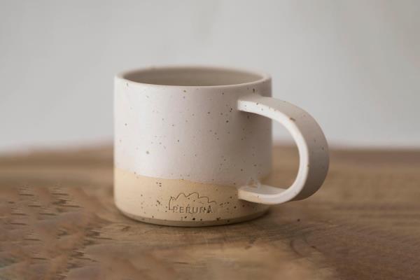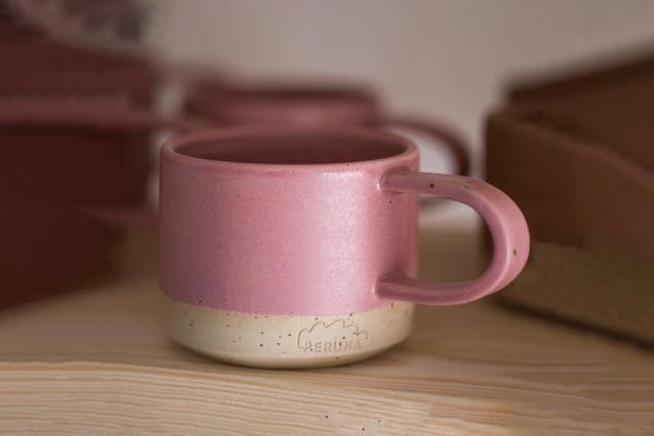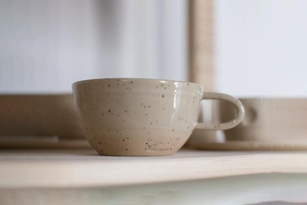 This hazel-coloured ceramic mug with an applied handle is cylindrically shaped and made of solid clay stoneware, with a matte brown glaze. The mug was fired at 1200 degrees celsius.
