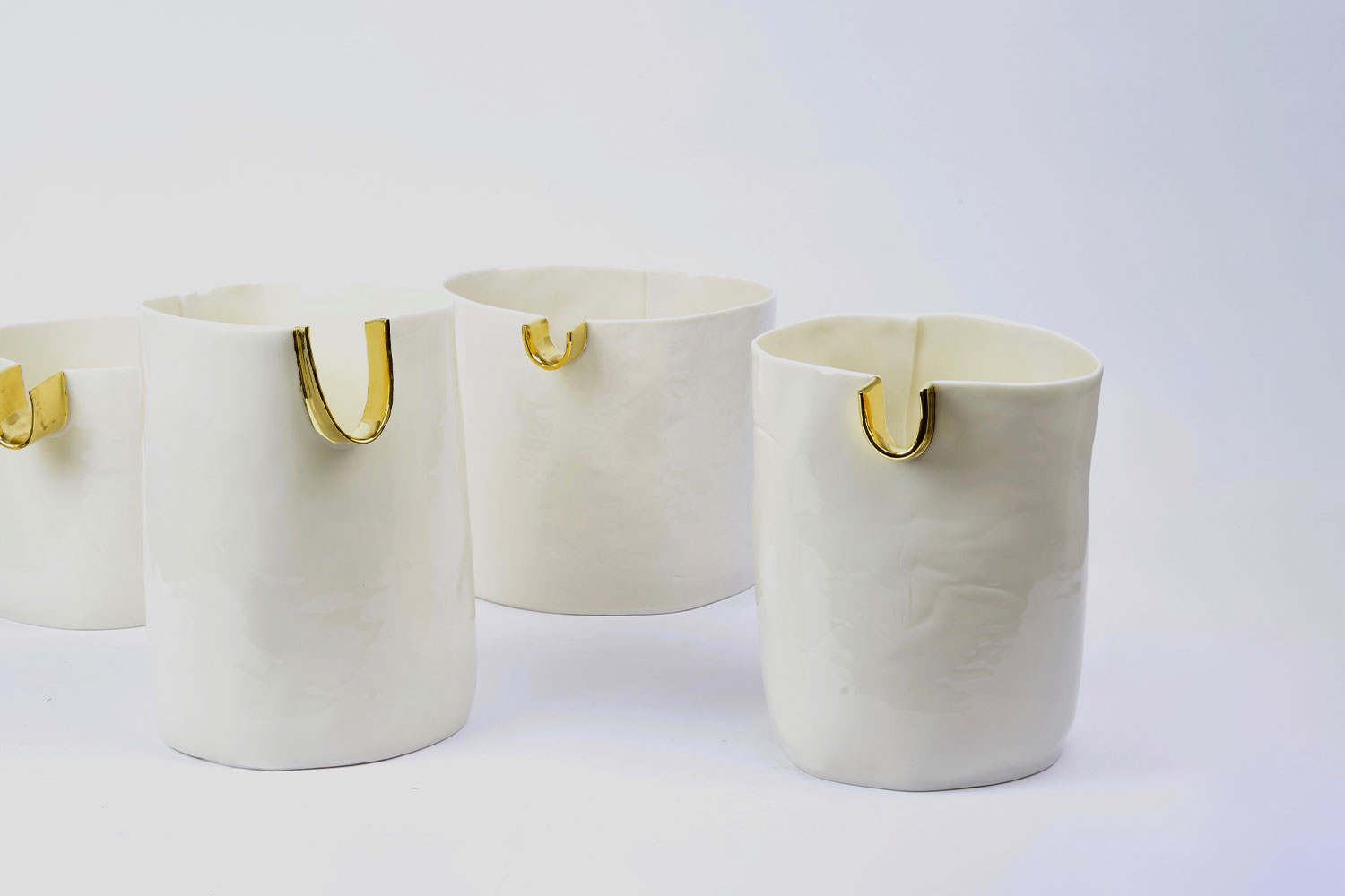 White porcelain small bowls with genuine gold luster décor. Created using the slab technique and leaving always something to the chance in such a way to obtain a simple and organic form, always unique. Every bowl is partially glazed, sanded smooth and fired twice to 1,255°C. The gold luster is applied and fired again to a lower temperature. All materials used are certified for food use.