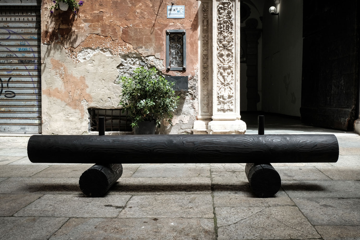 Inspired by Walser architecture, this work reveals at its best the idea of authenticity and simplicity of Riccardo's works. Made from local larch grown on the high peaks of the Italian Alps, the bench is assembled with just timber nails. Fire is the finish, enhancing its contemporary and timeless character. This is sculptural furniture at its best.