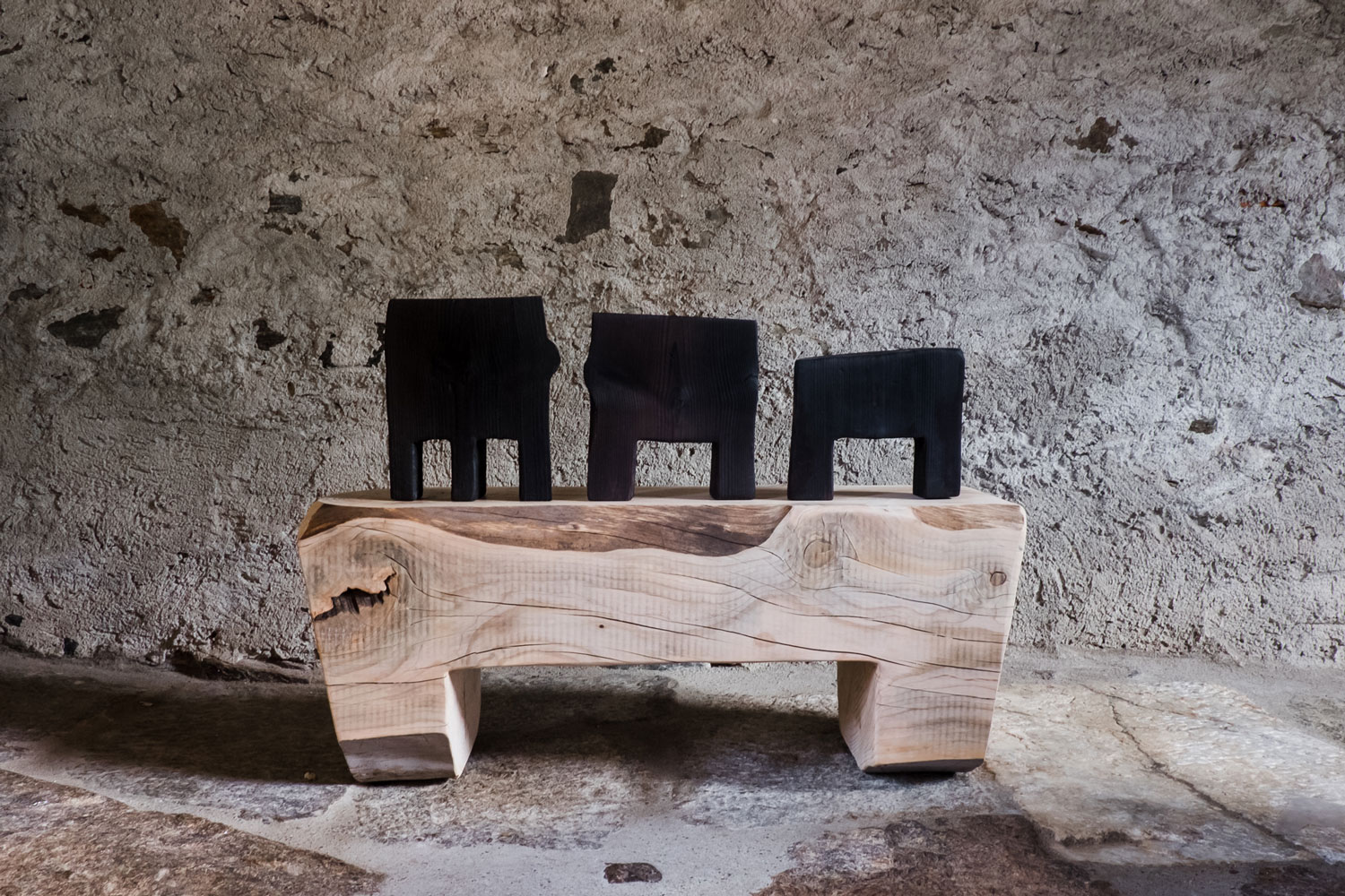 The short bench, or Panchetta corta, is made directly from a tree trunk, hand carved and treated naturally. The timber, cedar, has a strong balsamic and aromatic scent. In Riccardo's woodworking he has kept the texture and marks made in its creation. The top has a smooth natural finish enhancing the beautiful grain.