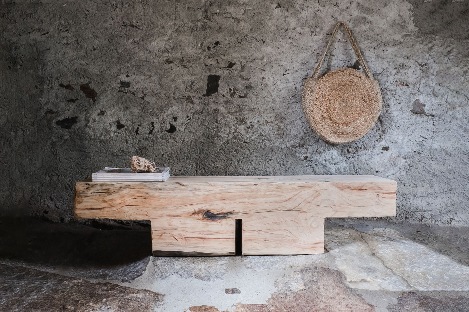 This cedar bench, Panchetta blonde, is made directly from a tree trunk, then carved by hand and treated naturally. The cedar has a strong balsamic and aromatic scent. The markings, the result of woodworking, give character and authenticity to this piece.