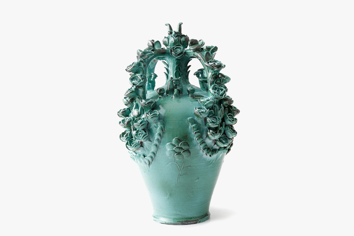 One of the most ancient creations of the Assemini ceramic tradition, the Brocca della Sposa (Bride's Pitcher) has been part of the wedding trousseau for centuries. The bride is traditionally given the pitcher on her wedding day: the flowers and pavoncelle (small peacocks) adorning it symbolise her beauty and purity. Also, the richer it is, the wealthier the bride's family is. Every piece is unique. This Brocca is handcrafted on the potter's wheel, then the hand shaped decorations are applied on it and finally it is glazed with oxides.