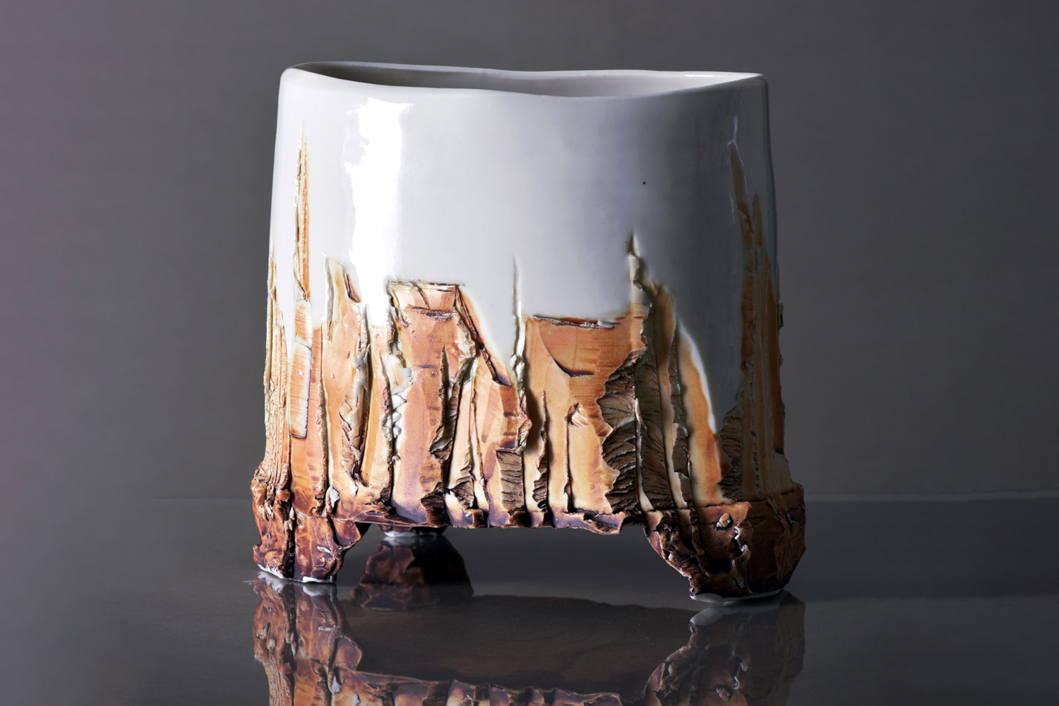 Tektonics is inspired by the way the tectonic plates meet and make mountains on Earth. It is made in hand thrown porcelain, with hand built feet. The surface is cut and distorted with a knife. The brown colour on the worked surface is a thin layer of stoneware clay on top of the porcelain clay.